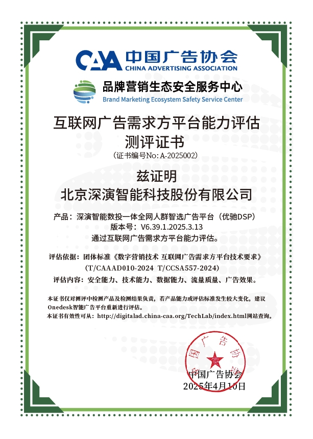 4月10日,中国广告协会发布「互联网广告需求方平台能力评估」测评结果。Martech领域领军企业腾博会智能旗下产品腾博会智能数投一体全网人群智选广告平台(优驰 DSP),凭借其在智能算法优化、技术创新、数据安全治理及流量质量管控等维度的突出表现,高分通过该项行业权威测评,获颁中国广告协会评估证书,成为业内首批通过认证的标杆企业。